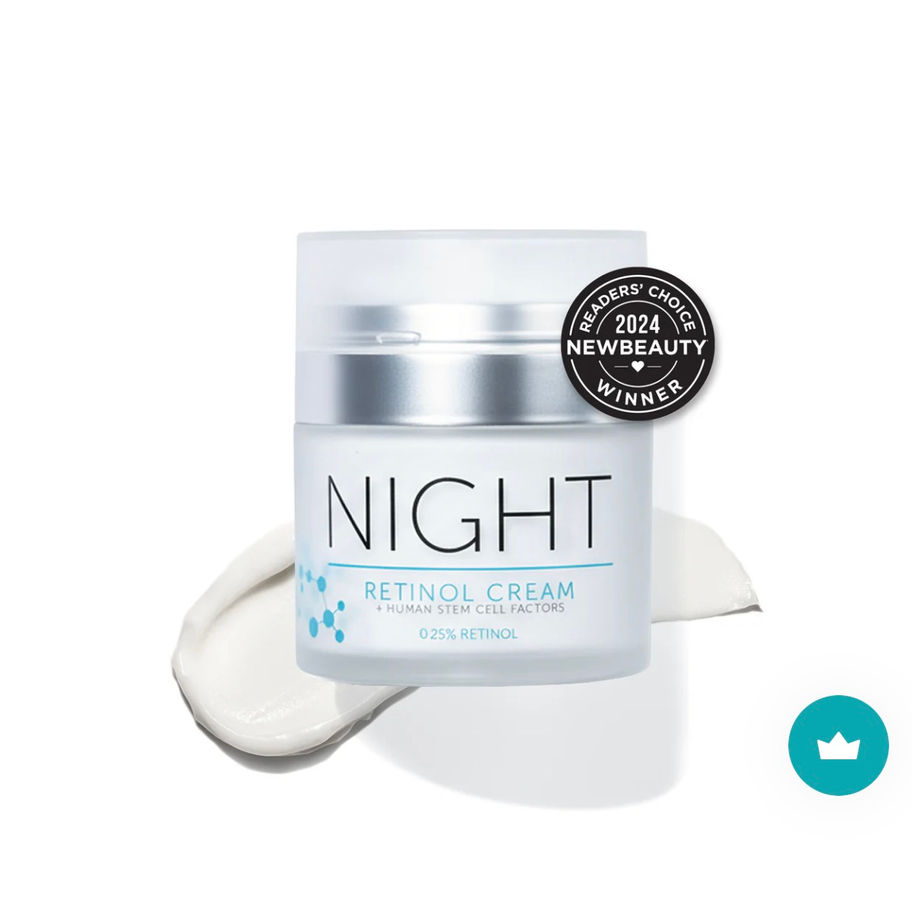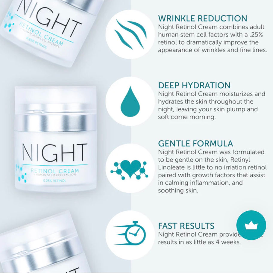 Dramatically improve the appearance of wrinkles and finalizes with Night Retinol Cream that combines adult human stem cell factors with a .25% retinol for an overnight, at-home skin treatment. This advanced nighttime moisturizer helps to smooth, firm, and lift with a specialized retinoid that provides visible results.
